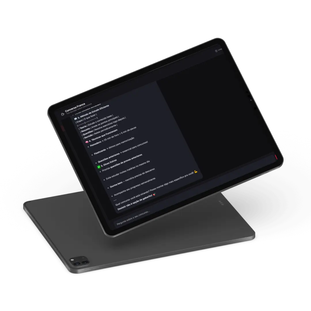 A plataforma completa para quem quer ser aprovado em concursos públicos em menos de 1 ano. Planejamento inteligente, cronograma personalizado, simulados no estilo da sua banca e técnicas de estudo comprovadas — tudo no mesmo lugar.