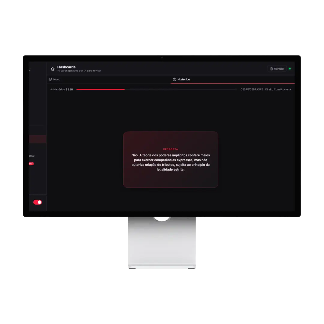 Flashcards criados automaticamente do assunto que você está estudando. Repetição espaçada sem precisar criar nada manualmente.