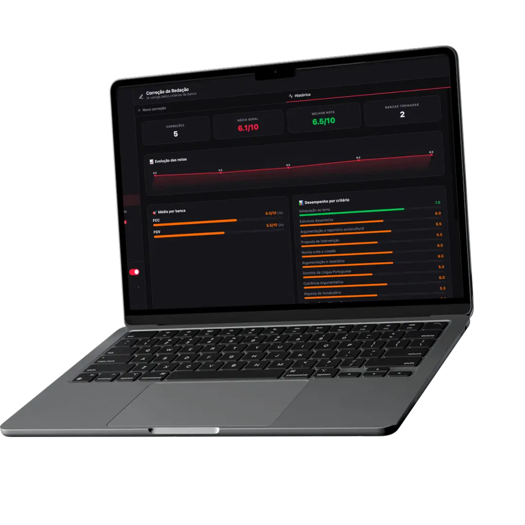 Foto ou PDF da sua redação. O sistema corrige pelos critérios exatos da sua banca com nota e feedback detalhado em cada critério.