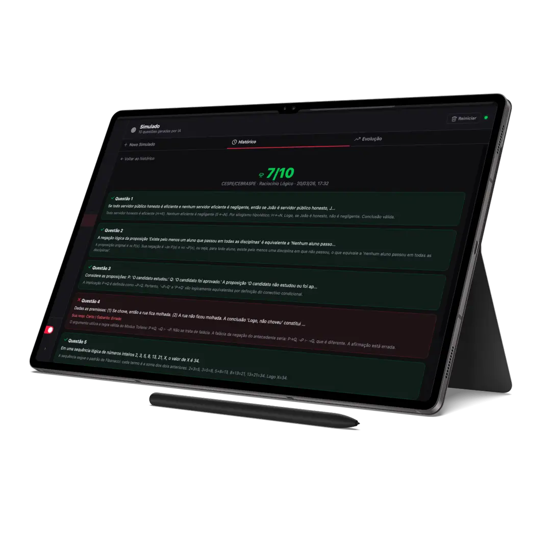 Questões no estilo da sua banca para a disciplina que você escolher. Responde, erra, aprende — com análise detalhada do que focar.